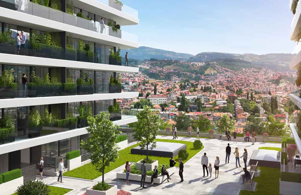 Među sadržajima koji se nalaze u krugu od 500 metara od same lokacije su državni i privatni vrtić, državna i međunarodna osnovna škola, te srednja škola sa međunarodnim diploma-programom. U bližoj okolini se također nalaze institucije kao što su Predsjedništvo BiH i Parlamentarna skupština, najvažniji gradski shopping i business centri, dvije Olimpijske sportske dvorane, gradski stadion, te Opšta bolnica i Klinički centar.